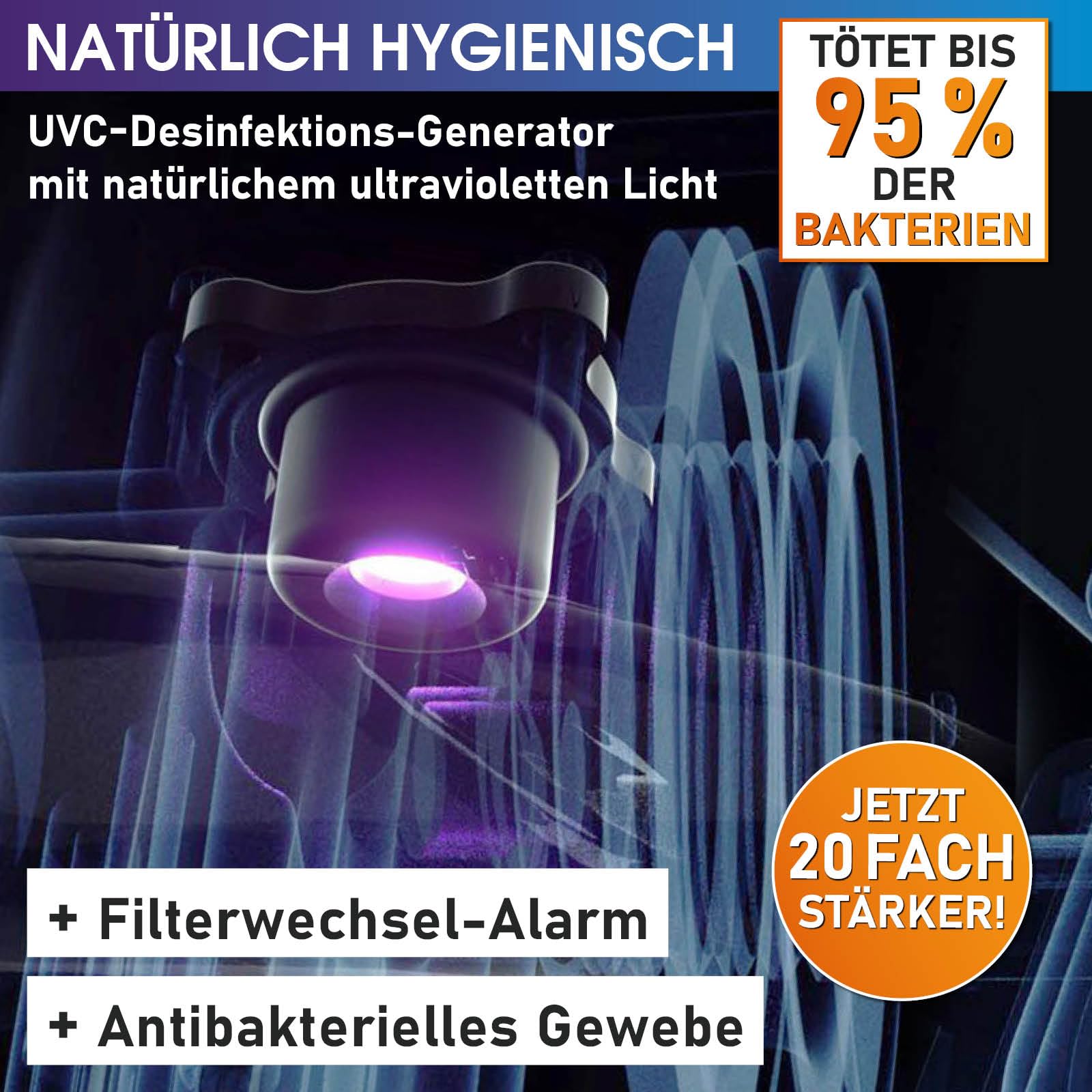 - 𝐍𝐚𝐭ü𝐫𝐥𝐢𝐜𝐡 𝐡𝐲𝐠𝐢𝐞𝐧𝐢𝐬𝐜𝐡 𝐝𝐚𝐧𝐤 𝐦𝐨𝐝𝐞𝐫𝐧𝐬𝐭𝐞𝐫 𝐓𝐞𝐜𝐡𝐧𝐢𝐤: Die verbesserte UVC-PLUS-Desinfektion eliminiert 95% der Bakterien mit ultrastarkem UV-Licht, ist umweltschonend, sicher auch während der Nutzung & jetzt sogar 20-fach stärker. Das antibakterielle Innengewebe reduziert die Bakterienvermehrung um 99%, während das automatische Filtersystem Schmutz effektiv filtert und der Filter-Alarm stets an einen Filterwechsel erinnert. Der Dispenser sorgt für eine gleichmäßige Auflösung von Reinigungstabletten