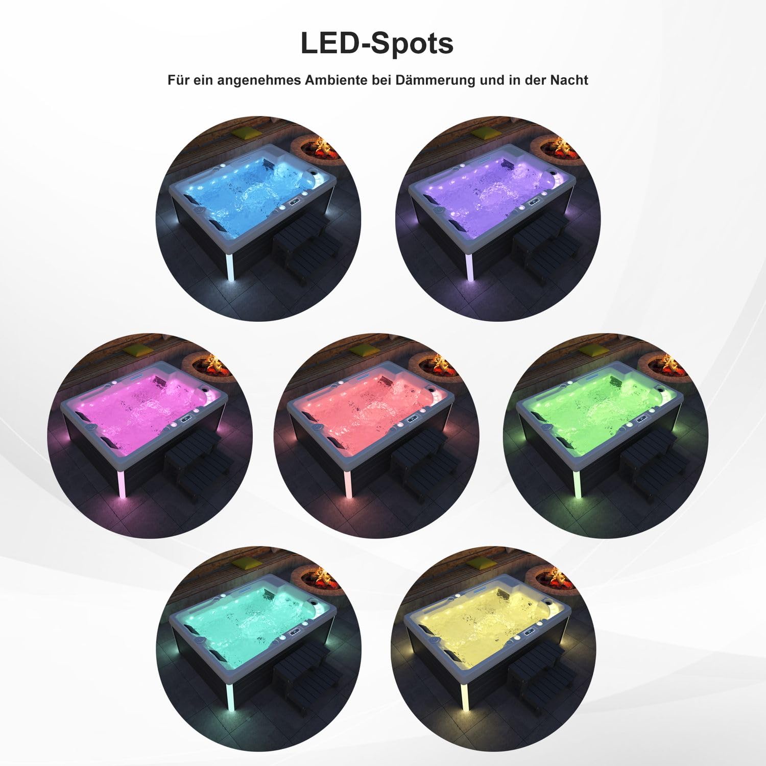 - Multifunktionale Ausstattung: Der ELBA Whirlpool bietet nicht nur 2 Liegeplätze und 1 Sitzplatz, sondern auch eine leistungsstarke 3 KW Edelstahlheizung und eine entspannende Farblichttherapie.